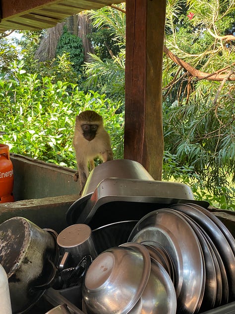 I made myself some toast for breakfast and a coffee. Taking the morning slowly, I finished my food and went to my tent to put something away before packing up all the breakfast food. Well, was that a mistake. The cheeky vervet monkey’s had descended on the loaf of bread I had left out, climbing all over our clean dishes without a care in the world.